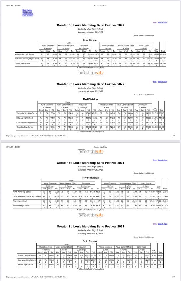 | Details:The Greater St. Louis Marching Band Festival has a rich tradition dating back to its inception back in 1971. The nostalgia of the Blue, Red, Silver and Gold is returning. The Greater St. Louis Marching Band Festival (GSLMBF) will be held on October 25, 2025 on the campus of Belleville West High School in conjunction with the Belleville East and West Band Parents. The deadline for entry is September 15, 2025. The entry fee for this year's festival is $300. An early registration fee of $250 will be in effect if you get you register by July 1. Bands will be grouped by a combination of school size and band size. Bands will be evenly split once the entire field of bands has entered the festival. Band splits will be divided equally as specified below. Small School/ Small Band - Blue Division Small School/ Large Band - Red Division Large School/ Small Band - Silver Division Large School/ Large Band - Gold Division Awards will be given in each class for placement as well as best Music, General Effect, Visual, Auxiliary and Percussion. The Red and Blue Division Bands will perform in the morning/ afternoon with a separate awards ceremony. The Silver and Gold Division Bands will perform in later afternoon/ evening. Performance order will be determined by a random draw to be held approximately 2 weeks prior to the festival. If you have any questions, please email Mark Tessereau at mtessereau@bths201.org