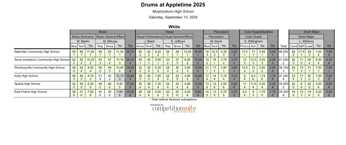 Grand Champion: McCracken County, KY | | Field 1A:48.000 Nashville Community (Music, Visual, Color Guard)