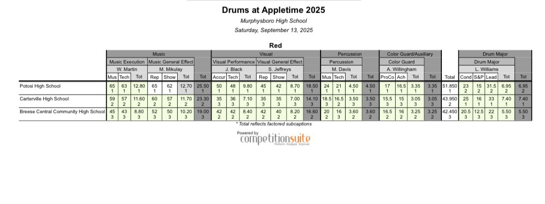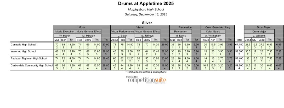 | Details:On behalf of the Murphysboro Apple Festival Committee, you are cordially invited to participate in the Apple Festival Grand Parade competition and Drums at Appletime Field Show competition on Saturday, September 13th, 2025. As has become the tradition, the parade competition will be open to junior high school, middle school, and high school bands. Drums at Appletime is for high school bands only. No one can resist the lure of a marching band and Drums at Appletime continues as one of Murphysboro Apple Festival\'s most popular events, drawing sell-out crowds year after year. From it\'s inception, featuring nationally touring Drum Corps like the Black Knights Drum & Bugle Corps, to today, showcasing the region\'s most talented high school marching bands, the level of competition has not changed! The Grand Parade is just a taste of the level of performance and musicianship these students possess - Drums at Appletime is where they really shine! Murphysboro\'s own Crimson Express began hosting in 1990 and have gone on to compete and win many major competitions throughout the United States and Canada. They continue to welcome marching bands from the area and beyond to this annual event and feature the talents of their members in exhibition at the end of the night. Concessions will be available around the east bleachers. We will take cashless payments! The Murphysboro Apple Festival has always sought to provide an event that is responsive to the educational needs of bands that participate. We strive to employ the highest quality adjudicators to evaluate your performances. Please consider joining us on Saturday, September 14th for both the Appletime Grand Parade and Drums at Appletime 2025! **To register for the 2025 Apple Festival Band competitions, please click here: https://www.facebook.com/drumsatappletimeBlank Score SheetWant to try to score the bands for this festival yourself? Click here to download a blank score sheet! |